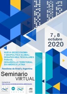 O Seminario virtual Nueva Geoeconomia y Geopolítica Global: Desafios Multiescalares para el Desarrollo Territorial en América Latina acontecera nos dias 7 e 8 de outubro de 2020, os panelistas participantes serão do Brasil e da Argentina. Inscrições no site do evento: http://www.ceur-conicet.gov.ar/eventos_academicos.php