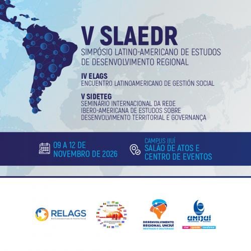 O V-SLAEDR (Simpósio Latino-americano de Estudos de Desenvolvimento Regional) se concretiza em 2026 de forma integrada com o IV-ELAGS (Encuentro Latinoameircano de Gestión Social) e o VII-SIDETEG (Seminário Internacional da Rede Ibero-Americana de Estudos sobre Desenvolvimento Territorial e Governança).